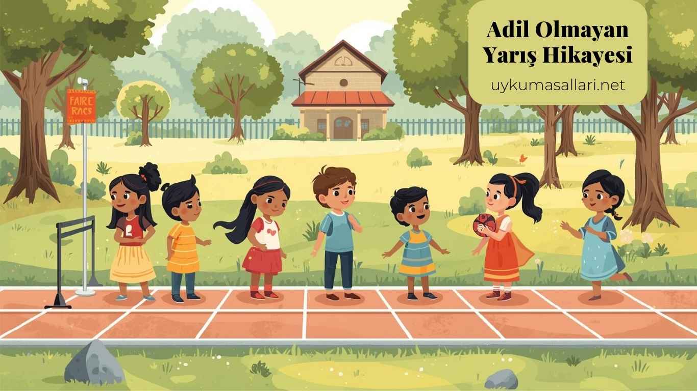 Yarışa katılmak isteyen herkes sıraya girmiş. Aralarında hızlı koşanlar da varmış, yavaş olanlar da. Ama hepsi heyecanlıymış. Yarışı düzenleyen görevli, parkın en hızlı çocuğu olan Berk’i çok severmiş. Onu hep ön plana çıkarırmış. Yarış başlamadan önce görevli, fark ettirmeden Berk’i en öne almış. Diğer çocukların durduğu çizgiyi biraz geriye çekmiş. Kimse tam olarak ne olduğunu anlamamış ama bazı çocuklar içten içe huzursuz olmuş. Koşu başladığında Berk hızla öne geçmiş. Diğer çocuklar var güçleriyle koşmuş ama aradaki mesafe kapanmamış. Yarış bitince Berk birinci ilan edilmiş. Bazı çocuklar sevinmiş ama bazıları üzülmüş. Çünkü içlerinde bir şeylerin doğru olmadığını hissedenler varmış. Kalabalığın içinden minik bir kız çocuğu elini kaldırmış. “Bu yarış adil olmadı,” demiş. Herkes ona bakmış. Görevli şaşırmış. Kız, çizgilerin aynı olmadığını fark ettiğini anlatmış. Diğer çocuklar da başlarıyla onaylamış. Görevli o an yaptığı hatayı anlamış. Yüzü kızarmış, utanmış. Görevli çocuklardan özür dilemiş. “Adil davranmam gerekir” demiş. Yarış yeniden düzenlenmiş. Bu kez herkes aynı çizgide durmuş.