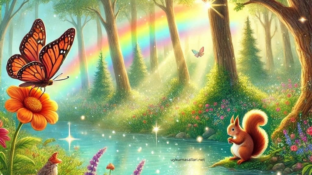 Bilgin diğer kelebeklerden farklı bir kelebekmiş. Bütün kelebekler çiçeklerin arasında uçarken Bilgin, sadece hayal kurarmış. En büyük hayali de “Gökkuşağına gitmekmiş” Günlerden bir gün bütün kelebekler ormanda dolaşırken, Bilgin’in uzandığını gören arkadaşı yanına gidip “Ne yapıyorsun Bilgin?” diye sormuş. Bilgin “Hayal kuruyorum” demiş. Arkadaşı “Ne hayali kuruyorsun?” diye sorunca, küçük kelebek bütün hayalini anlatmış. Bunu duyan kelebek gülmeye başlamış “Gökkuşağına gitmek mi? O kadar uzağa uçamazsın!” demiş. Ama Bilgin kararlıymış. Minik kanatlarını açmış ve renklerin kaynağını keşfetmek için yola koyulmuş. Yolculuğu sırasında, yaşlı bir sincap ona yön göstermiş: “Gökkuşağına ulaşmak istiyorsan, sabırlı olmalısın. Önce rüzgârı hissetmeyi öğren!” Sonra bir kuş Bilgin’e su kenarında gördüğü parıltıları anlatmış: “Gökkuşağı, yağmur damlaları ve güneşin buluştuğu yerde ortaya çıkar. Gökyüzünü iyi gözlemle!” Bilgin, rüzgârın fısıldadığı yolları dinlemiş, suyun parıltısını izlemiş ve sonunda gökyüzünde parlayan kocaman bir gökkuşağına ulaşmış. Renklerin arasında süzülmüş, her rengin kendine ait bir hikâyesi olduğunu öğrenmiş. Kırmızı cesareti, sarı mutluluğu, mavi huzuru temsil ediyormuş.
