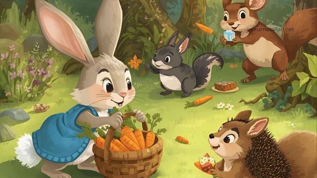 Günlerden bir gün sabah erkenden kalkıp bahçesine gitmiş. “Bugün hasat günü!” demiş sevinçle. Toprağı hafifçe eşelemiş, bir havuç çekmiş… Sonra bir tane daha… Derken bütün sepeti dolmuş! “Vay canına! Bu sene gerçekten çok havuç var!” diye sevinmiş. Tam eve dönüyormuş ki yolda küçük bir sincapla karşılaşmış. Sincap Zuzu, karnını tutarak mırıldanmış: “Ah Pufi… bu yıl fındıklar az oldu. Karnım aç…” Pufi gülümsemiş, sepetinden iki havuç çıkarıp Zuzu’ya uzatmış: “Al, Zuzu! Belki fındığın az ama bu havuçlar seni tok tutar.” Zuzu’nun gözleri parlamış. “Teşekkür ederim Pufi! Sen gerçekten çok iyisin.” Biraz sonra yürümeye devam ederken minik kirpi Lilo ile karşılaşmış. Lilo’nun annesi hasta olduğu için yiyecek toplamaya fırsatı olmamış. “Merhaba Pufi…” demiş Lilo çekinerek. “Bizim evde yiyecek bitti.” Pufi hiç düşünmeden birkaç havucu daha sepetinden çıkarıp Lilo’ya vermiş: “Annenle birlikte bunları pişirin. Havucun içi çok besleyicidir!” Lilo sevinçle zıplamış. “Teşekkür ederim Pufi! Annem çok mutlu olacak!” Günün sonunda Pufi’nin sepetinde neredeyse hiç havuç kalmamış. Eve dönerken bir an için “Acaba çok mu verdim?” diye düşünmüş. Sonra yol boyunca gördüğü mutlu yüzleri hatırlamış ve gülümsemiş. “Hayır,” demiş kendi kendine. “Paylaşınca eksilmez ki… tam tersi çoğalır!” Ertesi sabah bahçeye gittiğinde onu büyük bir sürpriz bekliyormuş. Zuzu, Lilo ve diğer hayvanlar bahçesinde onu bekliyormuş! Her biri kendi yiyeceklerinden biraz getirmiş: ceviz, böğürtlen, elma ve hatta bal… “Sen bizimle paylaştın, şimdi sıra bizde!” demişler hep bir ağızdan.